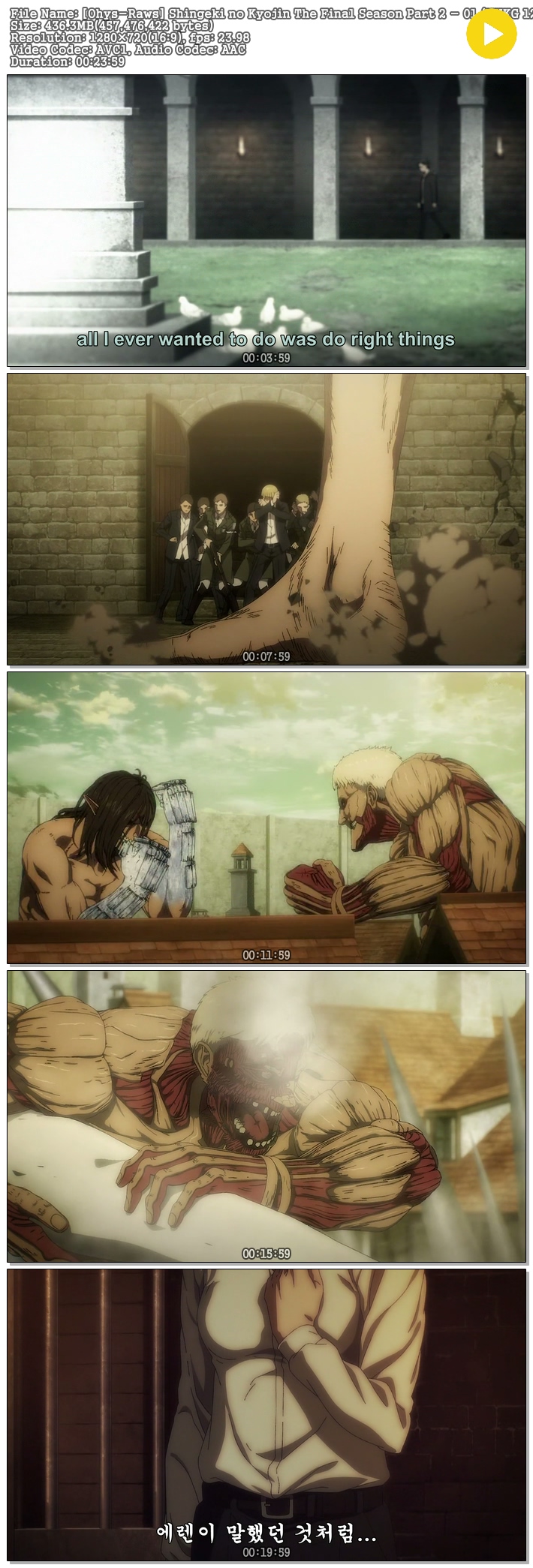 | [Ohys-Raws] Shingeki no Kyojin The Final Season Part 2 - 01 (NHKG 1280x720 x264 AAC JP).mp4 | 436.3 M | 00:23:59 | 1280x720 |