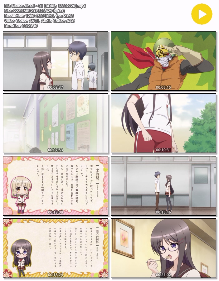 | Jinsei - 01 [BDRip 1280x720].mp4 | 222.5 M | 00:23:40 | 1280x720 |