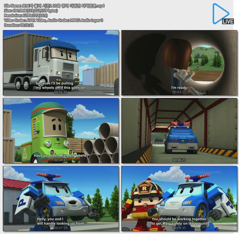 | 로보카 폴리 시즌1 20화 영어 더빙판 자막합본.mp4 | 495 M | 00:11:11 | 800X450 |