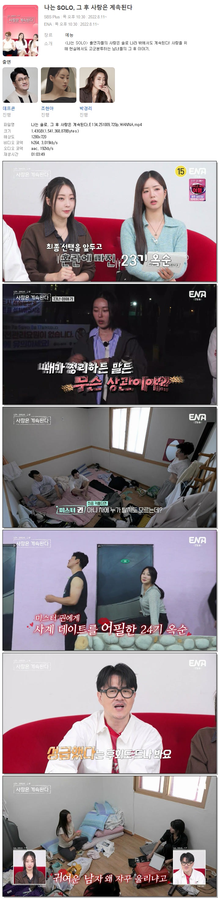 [ENA] 나는 솔로, 그 후 사랑은 계속된다.E134.251009.720p.WANNA[경리, 보미].mp4 | 1.4 G | 01:03:49 | 1280x720 |