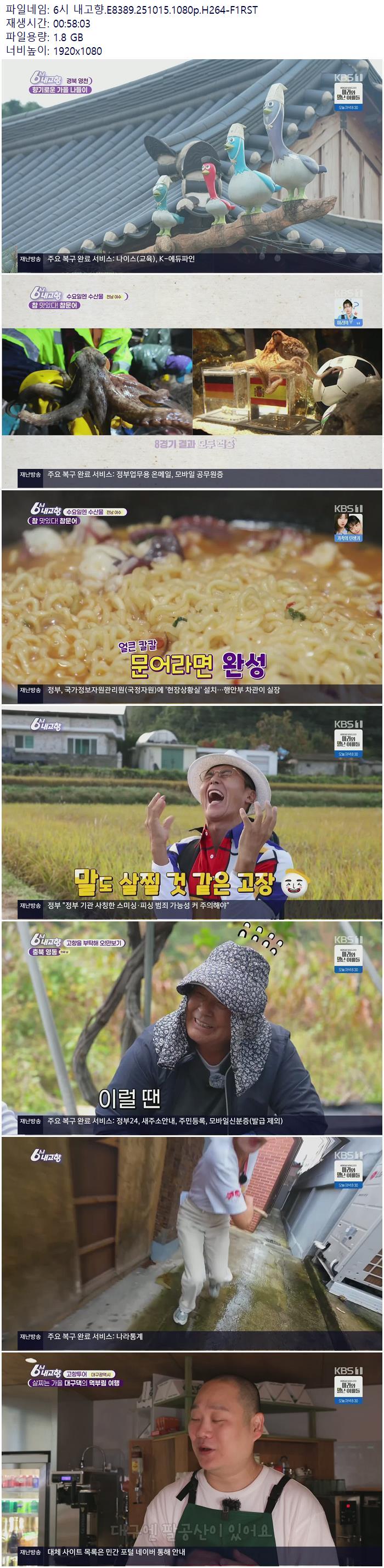 6시 내고향.E8389.251015.1080p.H264-F1RST.mp4 | 1.8 G | 00:58:03 | 1920x1080 |