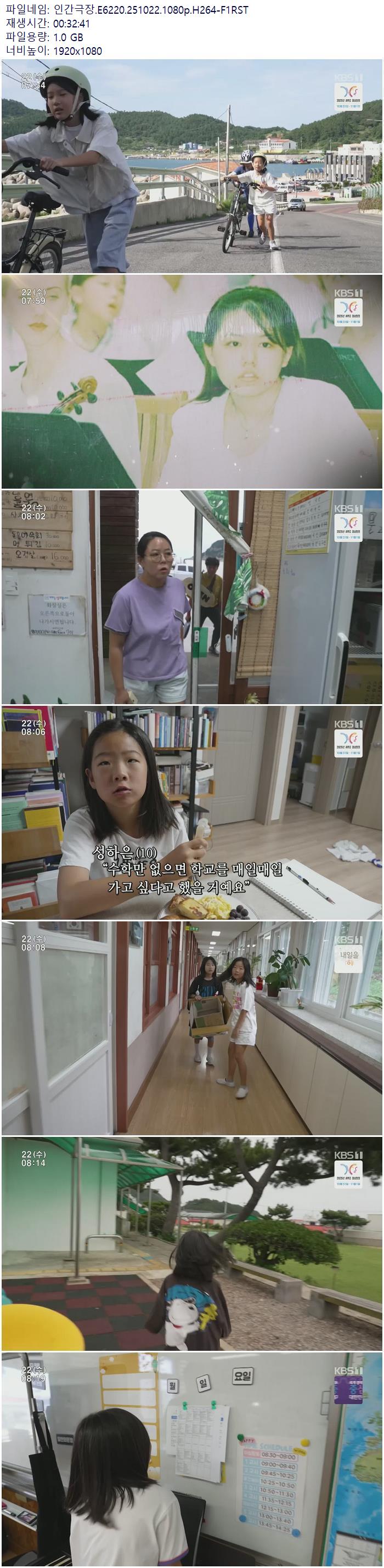 | 인간극장.E6220.251022.1080p.H264-F1RST.mp4 | 1 G | 00:32:41 | 1920x1080 |