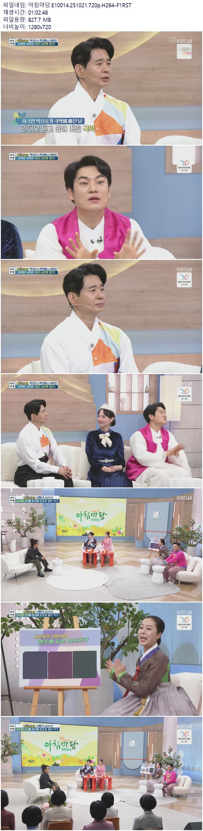 | 아침마당.E10014.251021.720p.H264-F1RST.mp4 | 827.7 M | 01:02:00 | 1280x720 |