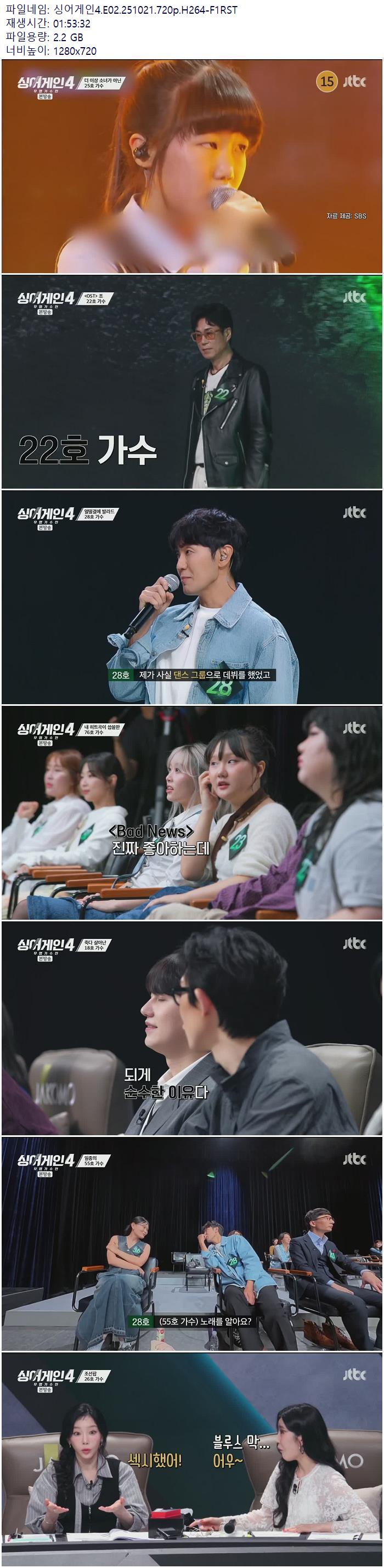 | 싱어게인4.E02.251021.720p.H264-F1RST.mp4 | 2.2 G | 01:53:00 | 1280x720 |