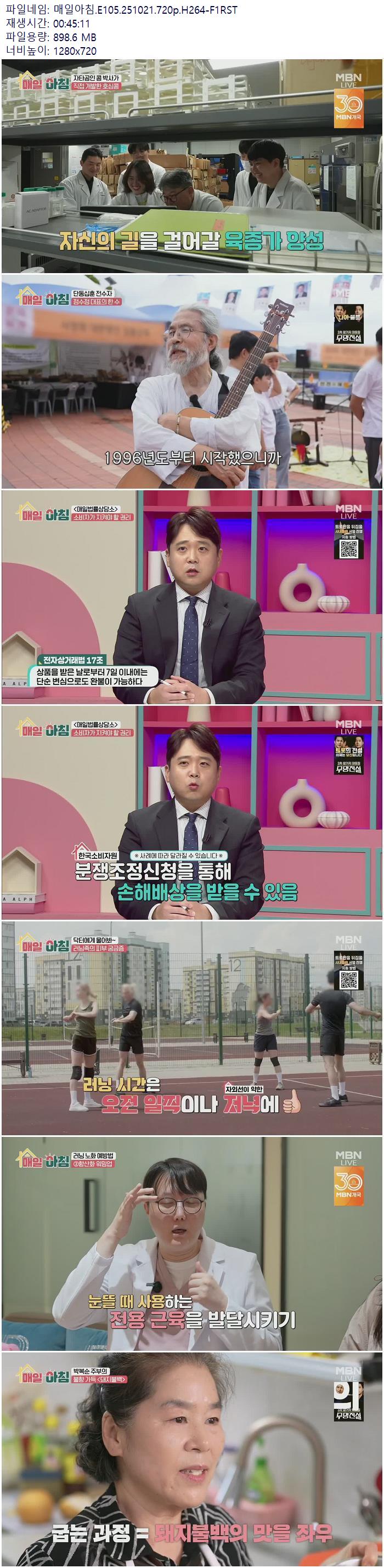 | 매일아침.E105.251021.720p.H264-F1RST.mp4 | 898.6 M | 00:45:11 | 1280x720 |