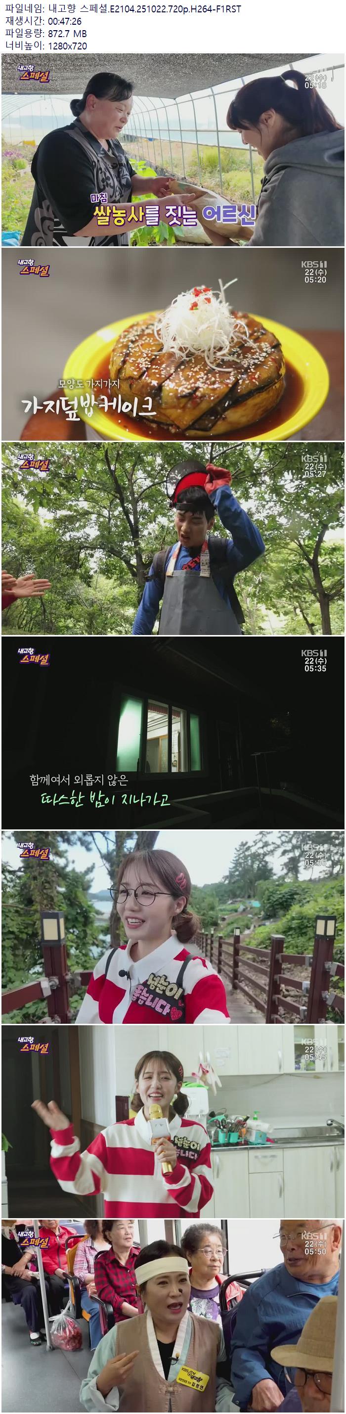 | 내고향 스페셜.E2104.251022.720p.H264-F1RST.mp4 | 872.7 M | 00:47:26 | 1280x720 |
