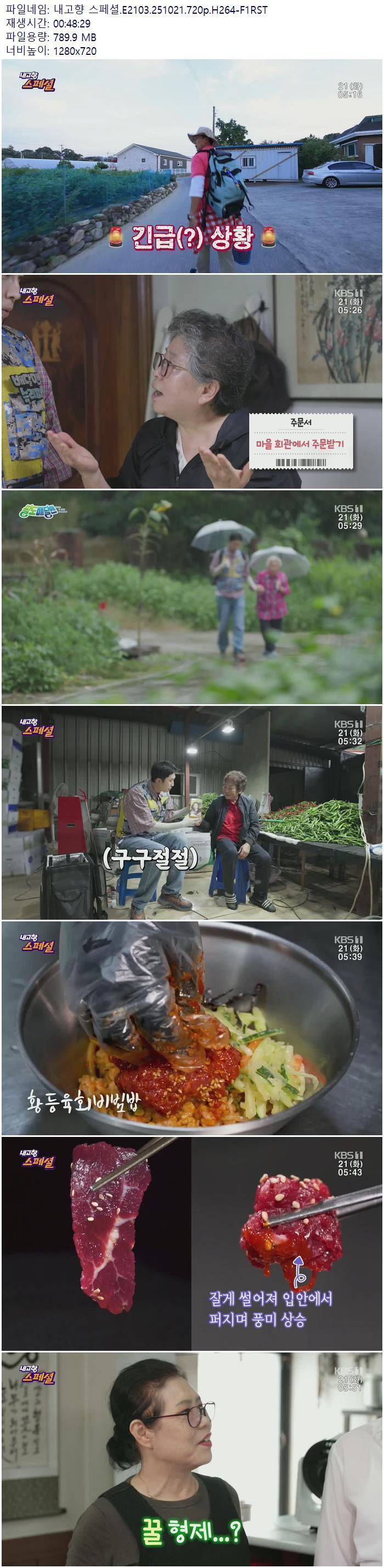 | 내고향 스페셜.E2103.251021.720p.H264-F1RST.mp4 | 789.9 M | 00:48:29 | 1280x720 |