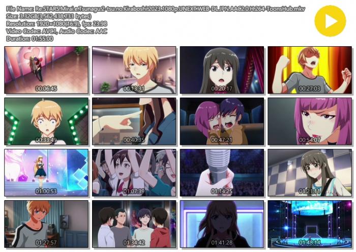 | Re.STARS.Mirai.e.Tsunagu.2-tsu.no.Kiraboshi.2023.1080p.UNEXT.WEB-DL.JPN.AAC2.0.H.264-ToonsHub.mkv | 3.3 G | 01:55:00 | 1920x1080 |