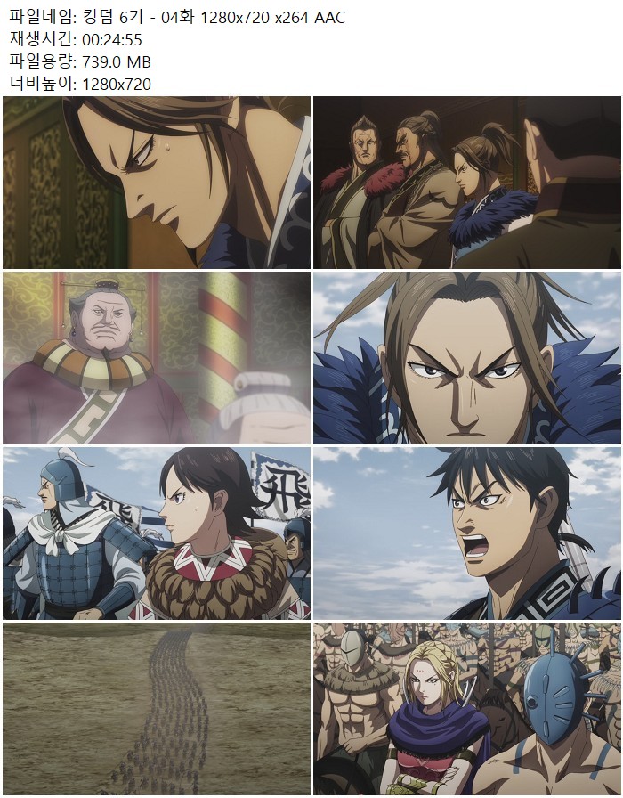 | 킹덤 6기 - 04화 1280x720 x264 AAC.mkv | 739 M | 00:24:55 | 1280x720 |