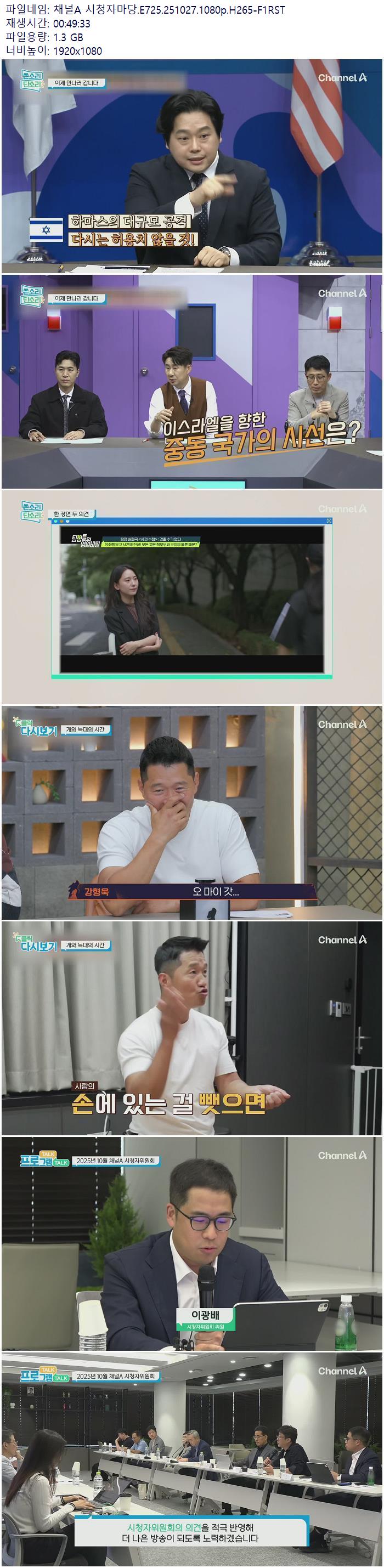 | 채널A 시청자마당.E725.251027.1080p.H265-F1RST.mp4 | 1.3 G | 00:49:33 | 1920x1080 |
