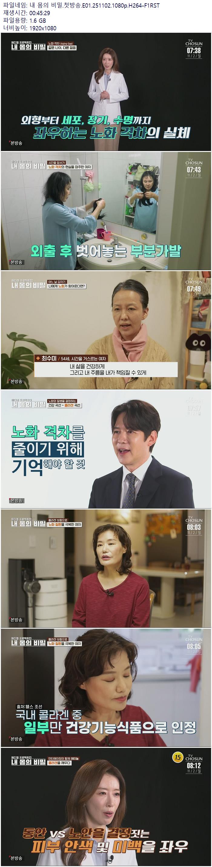 | 내 몸의 비밀.첫방송.E01.251102.1080p.H264-F1RST.mp4 | 1.6 G | 00:45:29 | 1920x1080 |