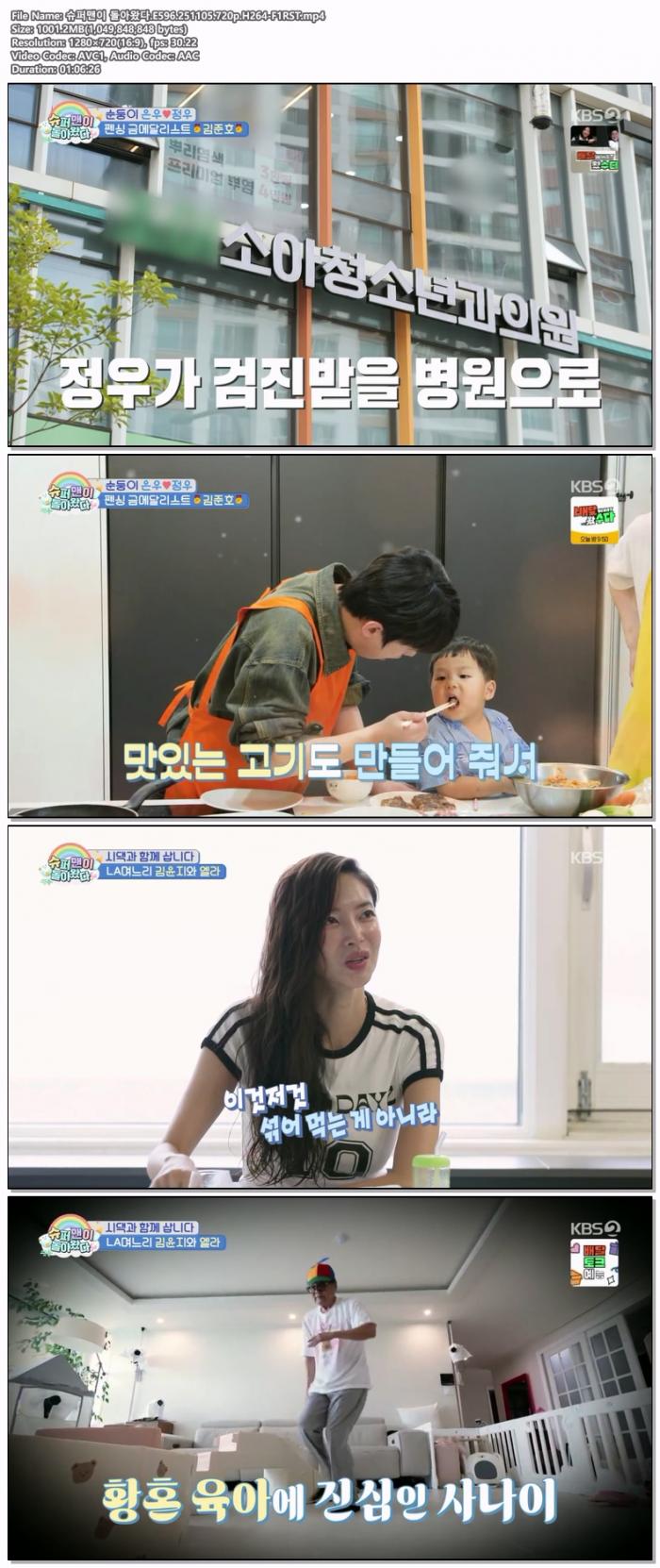 | 슈퍼맨이 돌아왔다.E596.251105.720p.H264-F1RST.mp4 | 1001.2 M | 01:06:00 | 1280x720 |