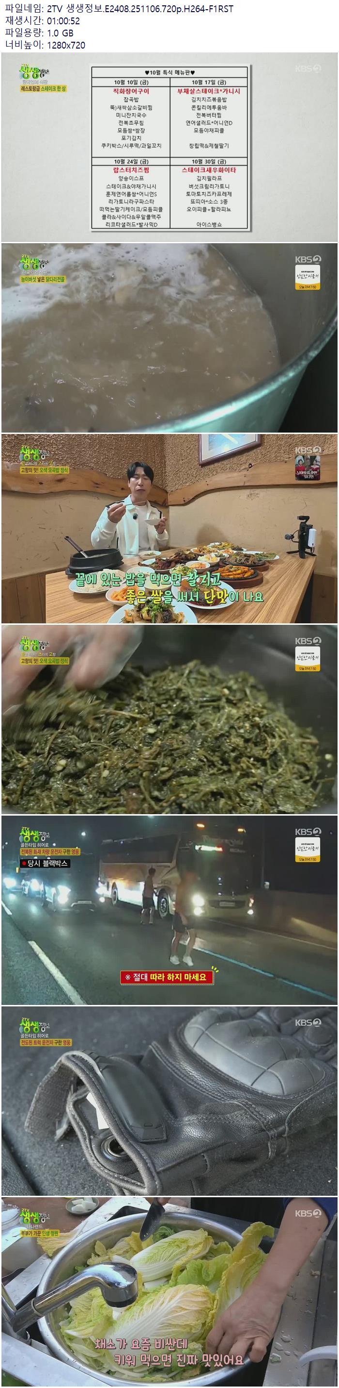 | 2TV 생생정보.E2408.251106.720p.H264-F1RST.mp4 | 1 G | 01:00:00 | 1280x720 |