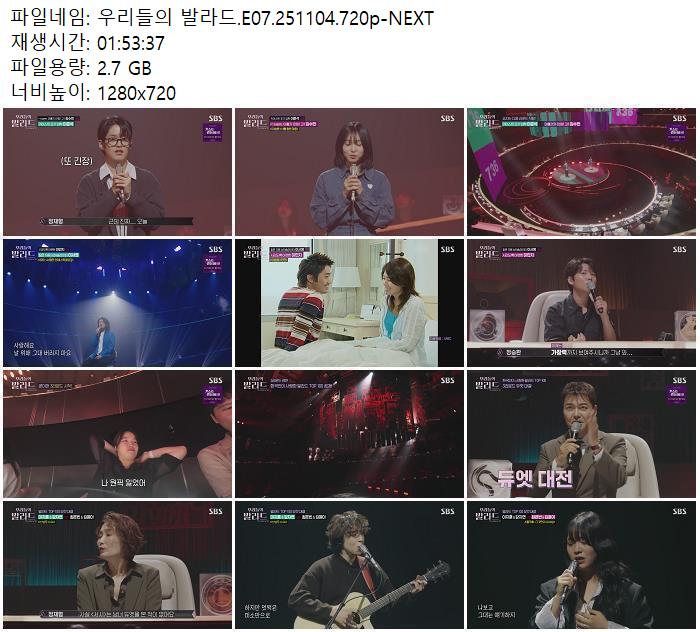 | 우리들의 발라드.E07.251104.720p-NEXT.mp4 | 2.7 G | 01:53:00 | 1280x720 |