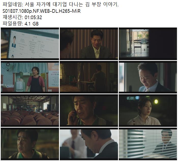 | 서울 자가에 대기업 다니는 김 부장 이야기.S01E07.1080p.NF.WEB-DL.H265-MiR.mkv | 4.1 G | 01:05:00 | 1920x1080 |