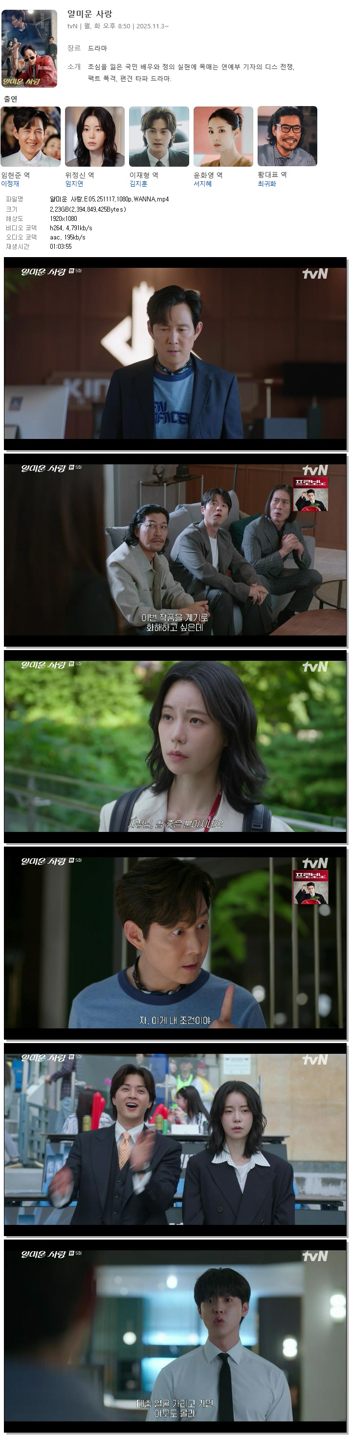 | [TVN] 얄미운 사랑.E05.251117.1080p.WANNA[이정재, 임지연].mp4 | 2.2 G | 01:03:55 | 1920x1080 |