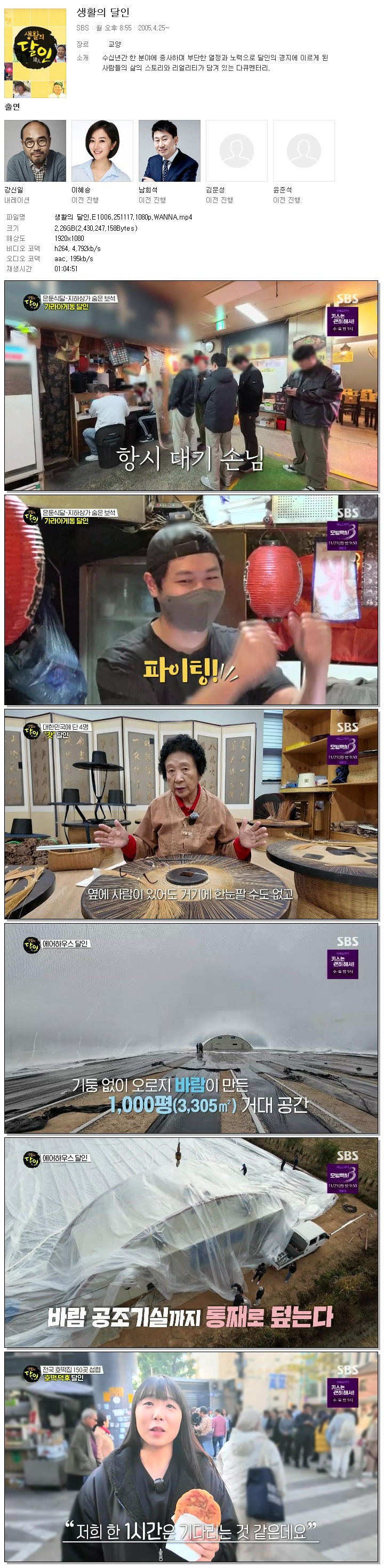 | [SBS] 생활의 달인.E1006.251117.1080p.WANNA.mp4 | 2.3 G | 01:04:51 | 1920x1080 |