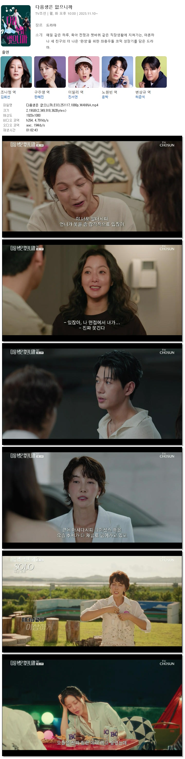 | [TV조선] 다음생은 없으니까.E03.251117.1080p.WANNA[김희선, 한혜진].mp4 | 2.2 G | 01:02:43 | 1920x1080 |