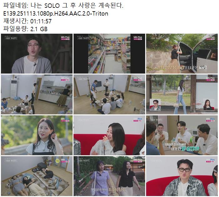 | 나는 SOLO 그 후 사랑은 계속된다.E139.251113.1080p.H264.AAC.2.0-Triton.mkv | 2.1 G | 01:11:00 | 1920x1080 |