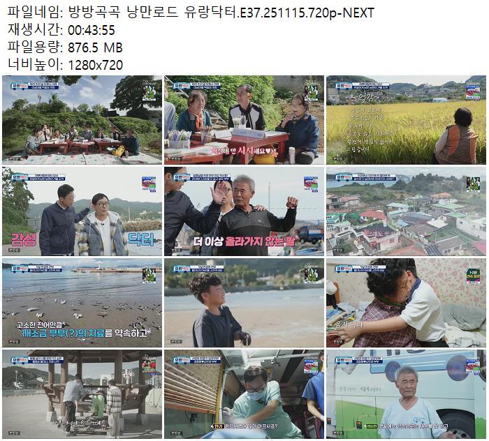 | 방방곡곡 낭만로드 유랑닥터.E37.251115.720p-NEXT.mp4 | 876.5 M | 00:43:55 | 1280x720 |