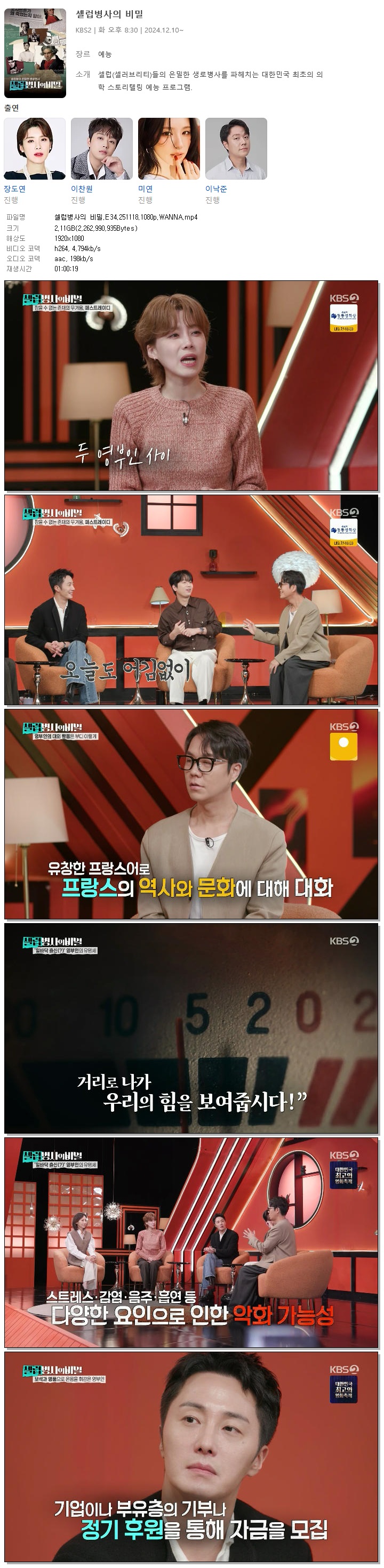 | [KBS2] 셀럽병사의 비밀.E34.251118.1080p.WANNA[장도연, 이찬원].mp4 | 2.1 G | 01:00:19 | 1920x1080 |