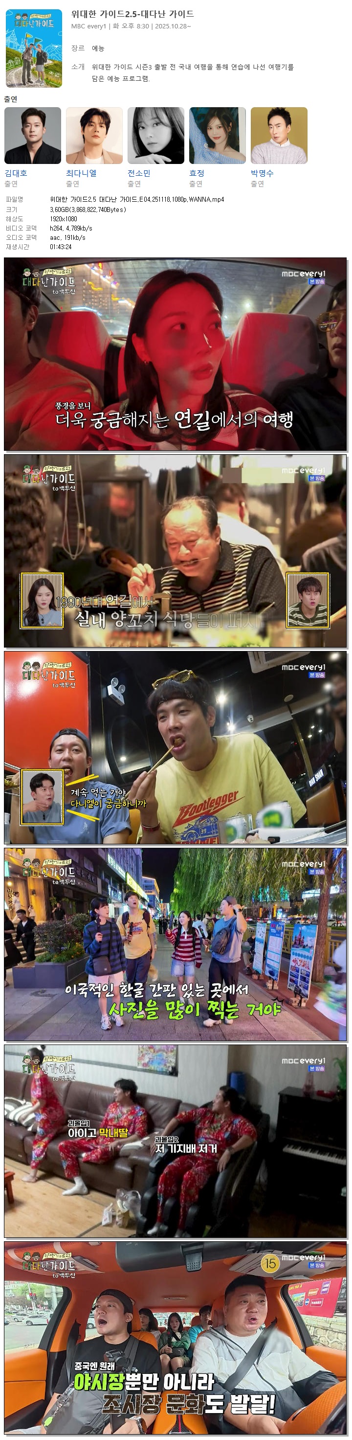 | [MBC Every1] 위대한 가이드2.5 대다난 가이드.E04.251118.1080p.WANNA[김대호, 최다니엘].mp4 | 3.6 G | 01:43:24 | 1920x1080 |