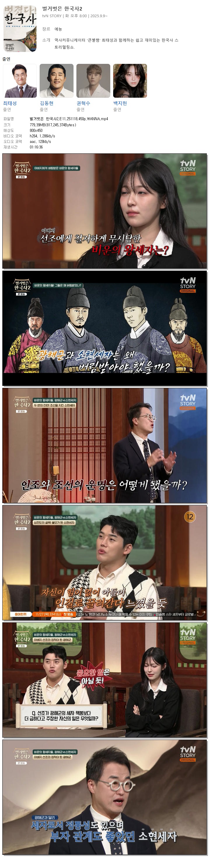 [TVN STORY] 벌거벗은 한국사2.E11.251118.450p.WANNA[권혁수, 백지헌].mp4 779.4 M 01:16:36 800x450