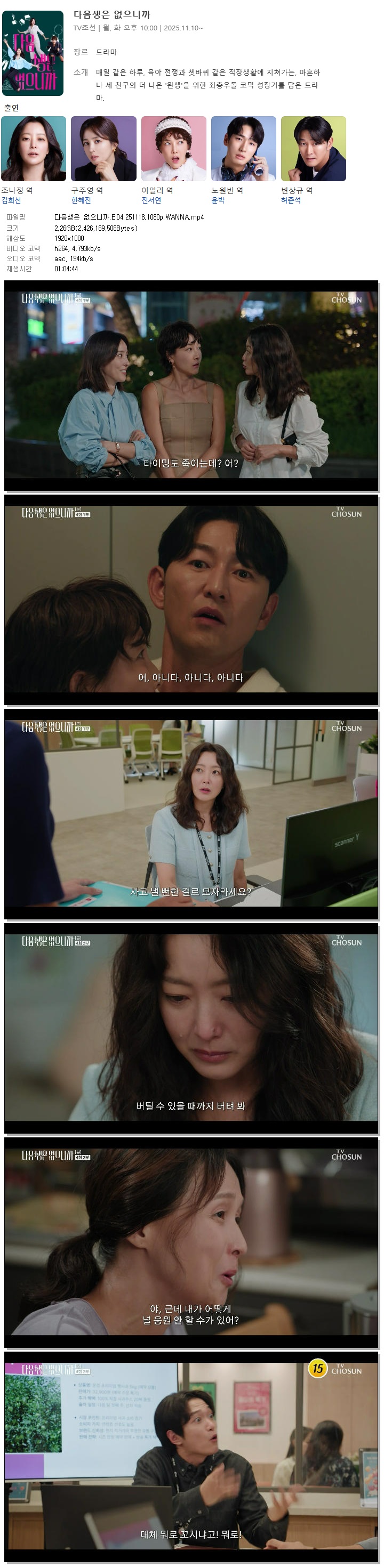 | [TV조선] 다음생은 없으니까.E04.251118.1080p.WANNA[김희선, 한혜진].mp4 | 2.3 G | 01:04:44 | 1920x1080 |