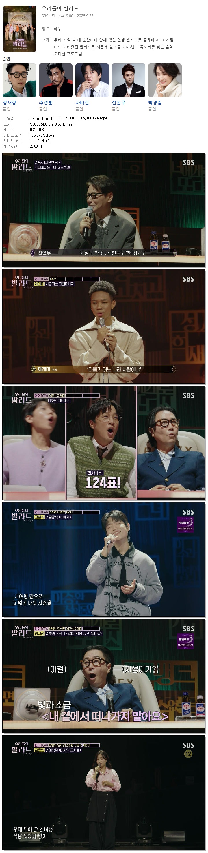 | [SBS] 우리들의 발라드.E09.251118.1080p.WANNA[정재형, 추성훈].mp4 | 4.3 G | 02:03:11 | 1920x1080 |