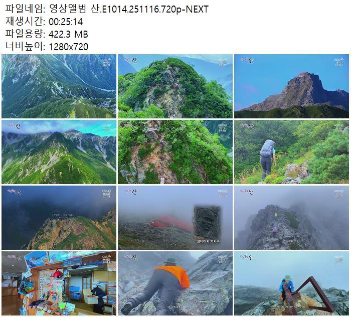 | 영상앨범 산.E1014.251116.720p-NEXT.mp4 | 422.3 M | 00:25:14 | 1280x720 |