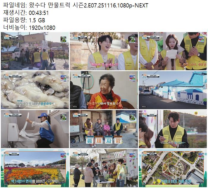 | 왔수다 만물트럭 시즌2.E07.251116.1080p-NEXT.mp4 | 1.5 G | 00:43:51 | 1920x1080 |