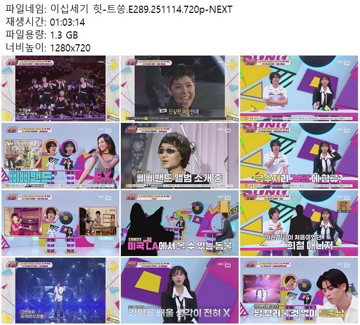 | 이십세기 힛-트쏭.E289.251114.720p-NEXT.mp4 | 1.3 G | 01:03:00 | 1280x720 |