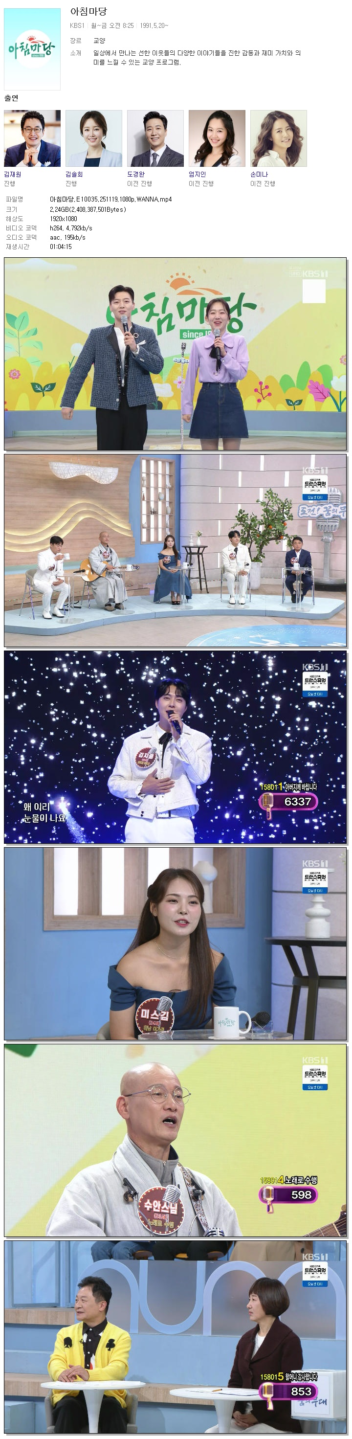 | [KBS1] 아침마당.E10035.251119.1080p.WANNA[김재원, 엄지인].mp4 | 2.2 G | 01:04:15 | 1920x1080 |