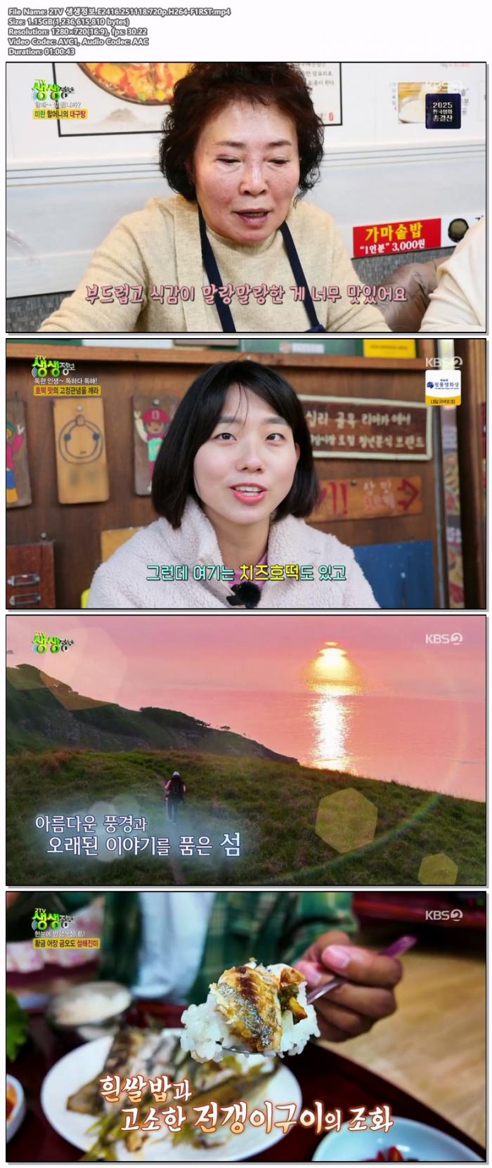 | 2TV 생생정보.E2416.251118.720p.H264-F1RST.mp4 | 1.2 G | 01:00:00 | 1280x720 |