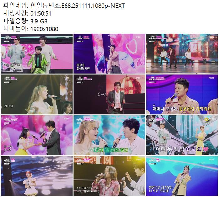 | 한일톱텐쇼.E68.251111.1080p-NEXT.mp4 | 3.9 G | 01:50:00 | 1920x1080 |