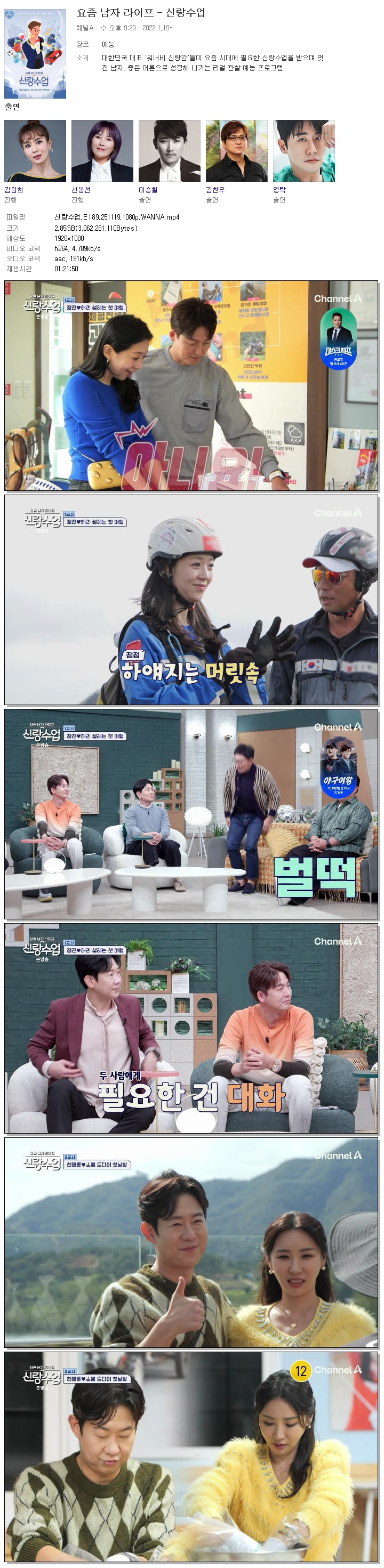 | [채널A] 신랑수업.E189.251119.1080p.WANNA[이정진, 천명훈].mp4 | 2.9 G | 01:21:50 | 1920x1080 |