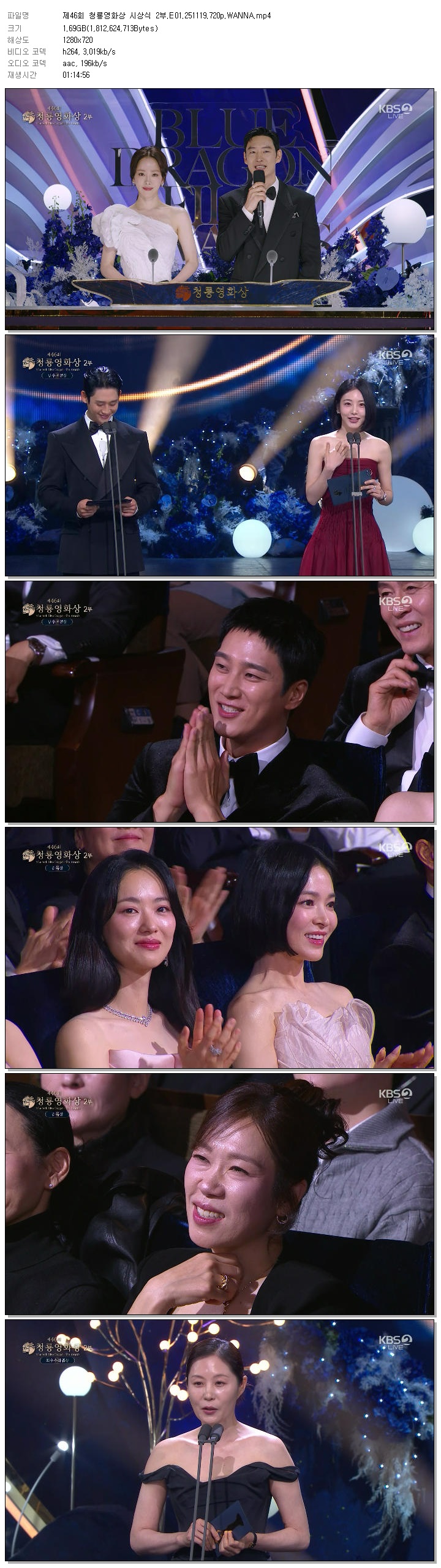 | [KBS2] 제46회 청룡영화상 시상식 2부.E01.251119.720p.WANNA[이제훈, 한지민].mp4 | 1.7 G | 01:14:56 | 1280x720 |
