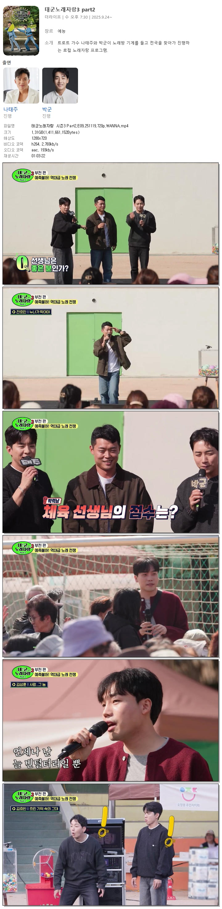 [더라이프] 태군노래자랑 시즌3 Part2.E09.251119.720p.WANNA[나태주, 박군].mp4 1.3 G 01:03:22 1280x720