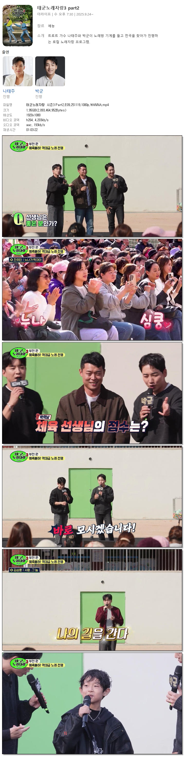 | [더라이프] 태군노래자랑 시즌3 Part2.E09.251119.1080p.WANNA[나태주, 박군].mp4 | 1.9 G | 01:03:22 | 1920x1080 |