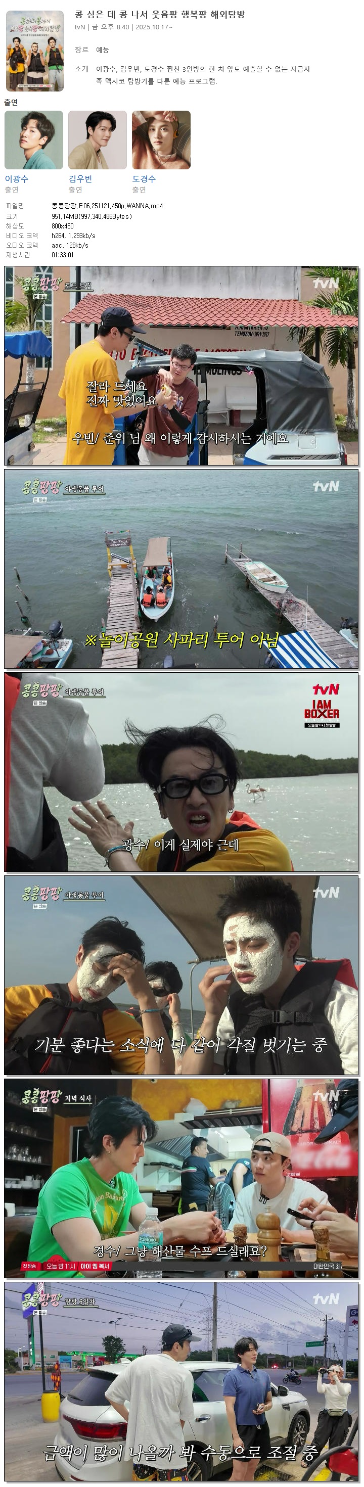 | [TVN] 콩콩팡팡.E06.251121.450p.WANNA[이광수, 김우빈].mp4 | 951.1 M | 01:33:01 | 800x450 |