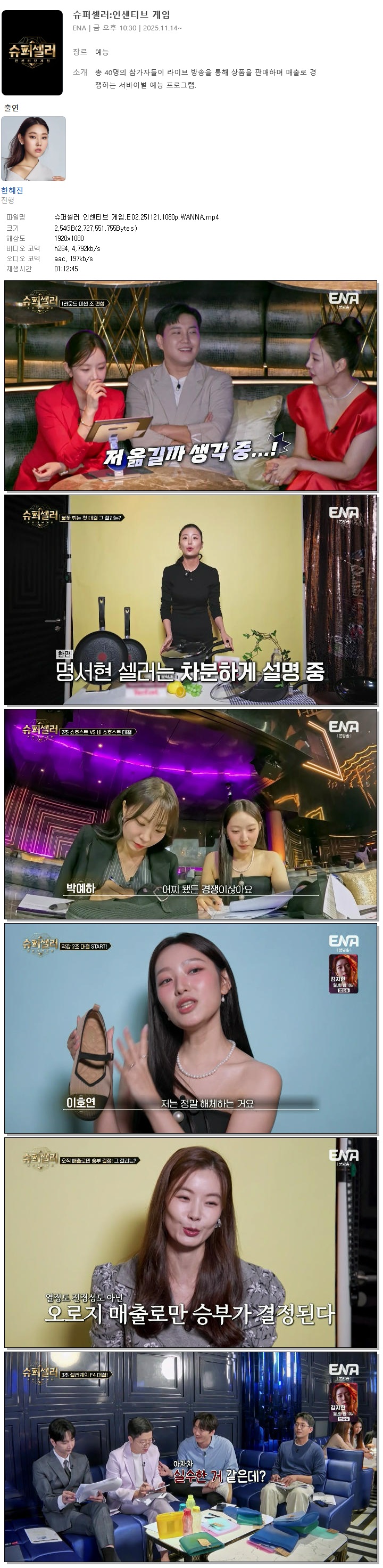| [ENA] 슈퍼셀러 인센티브 게임.E02.251121.1080p.WANNA[한혜진].mp4 | 2.5 G | 01:12:45 | 1920x1080 |