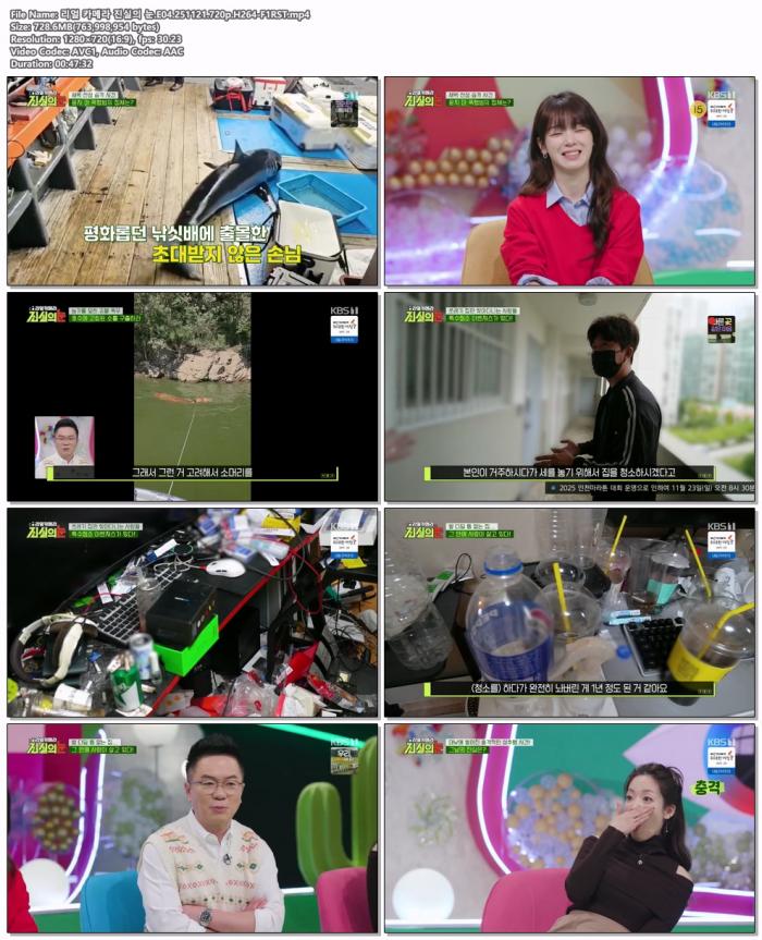 | 리얼 카메라 진실의 눈.E04.251121.720p.H264-F1RST.mp4 | 728.6 M | 00:47:32 | 1280x720 |