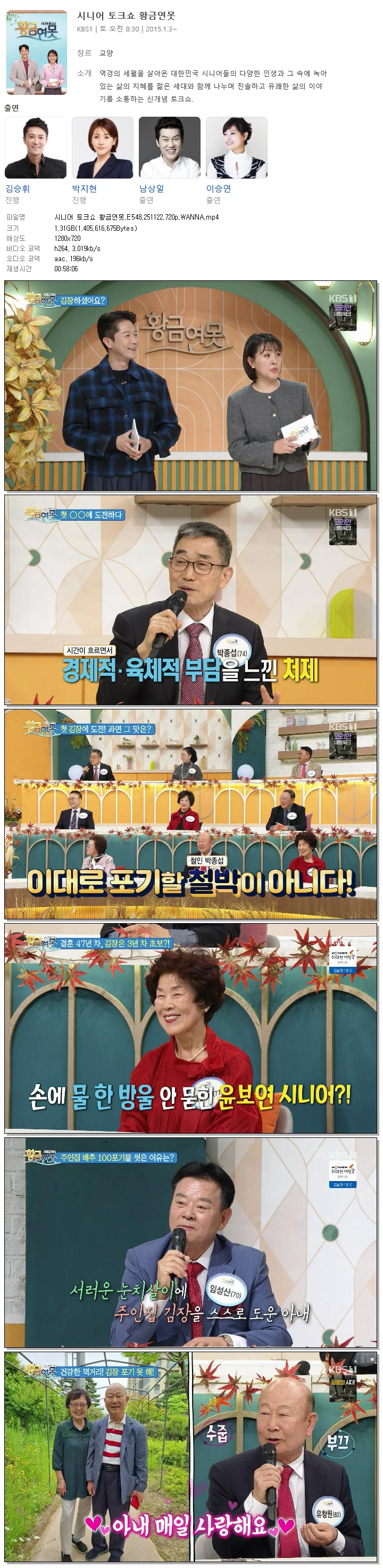 | [KBS1] 시니어 토크쇼 황금연못.E548.251122.720p.WANNA[김승휘, 박지현].mp4 | 1.3 G | 00:58:06 | 1280x720 |