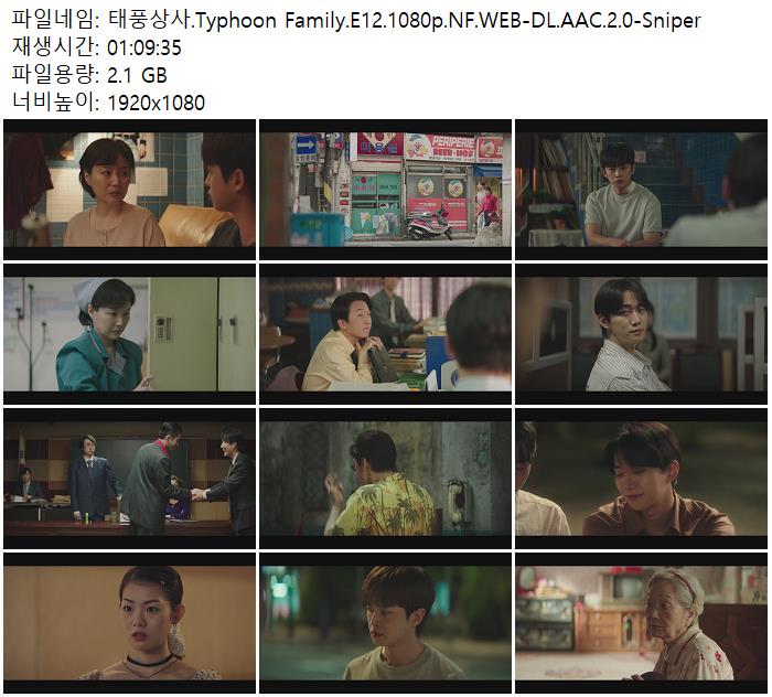 | 태풍상사.Typhoon Family.E12.1080p.NF.WEB-DL.AAC.2.0-Sniper.mkv | 2.1 G | 01:09:00 | 1920x1080 |