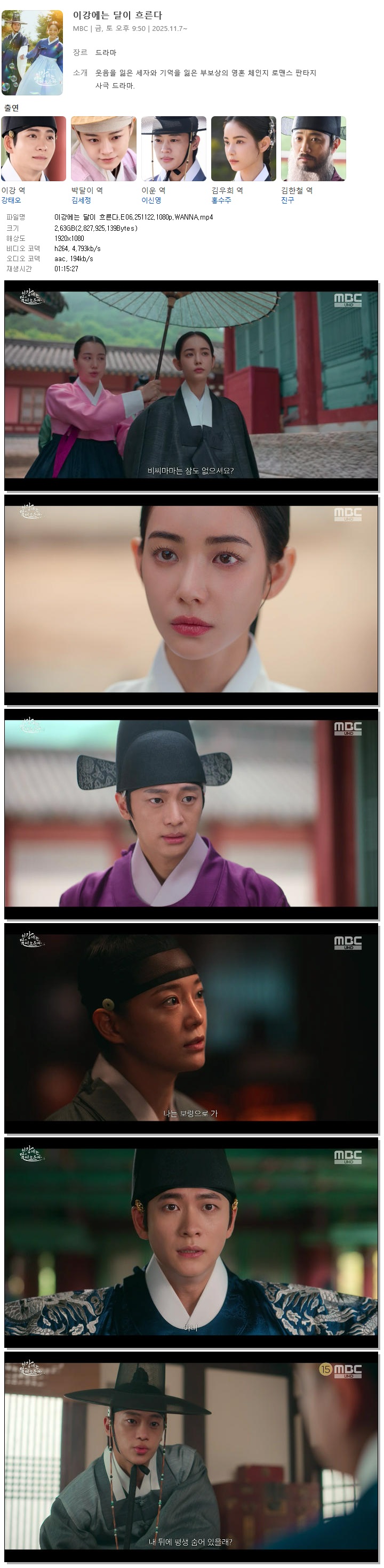 | [MBC] 이강에는 달이 흐른다.E06.251122.1080p.WANNA[강태오, 김세정].mp4 | 2.6 G | 01:15:27 | 1920x1080 |