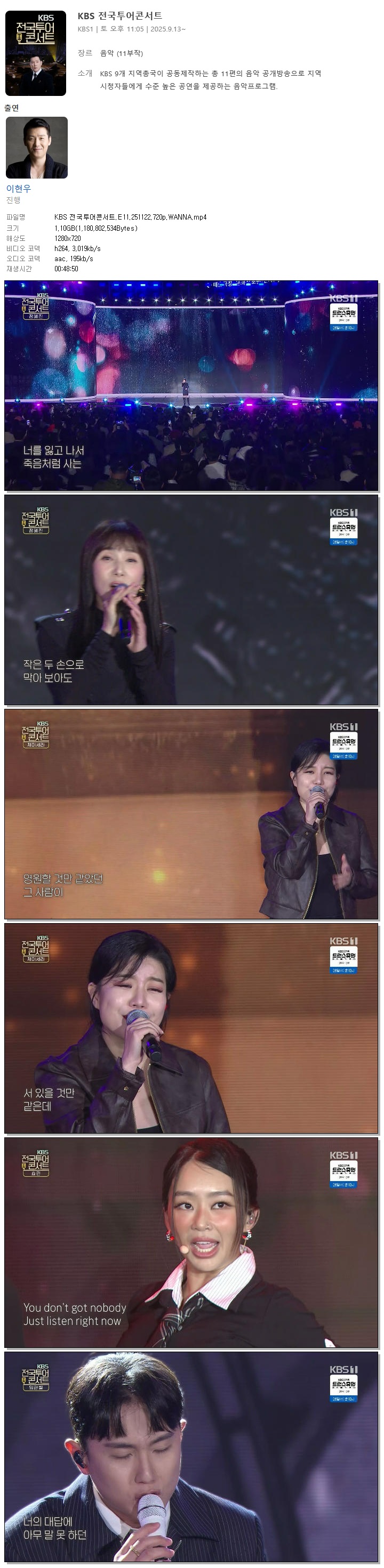 [KBS1] KBS 전국투어콘서트.E11.251122.720p.WANNA[이현우].mp4 1.1 G 00:48:50 1280x720