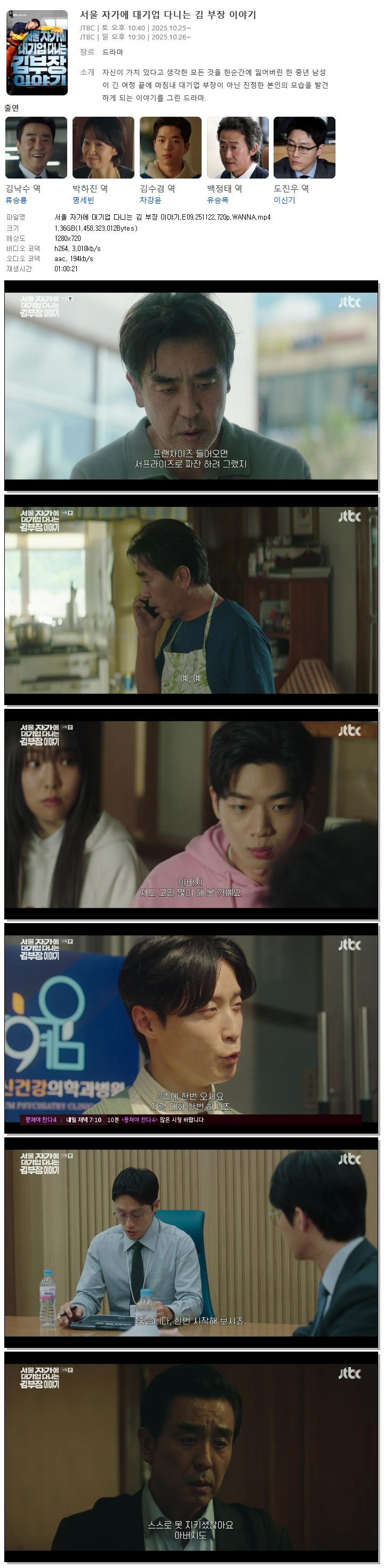 | [JTBC] 서울 자가에 대기업 다니는 김 부장 이야기.E09.251122.720p.WANNA[류승룡, 명세빈].mp4 | 1.4 G | 01:00:21 | 1280x720 |