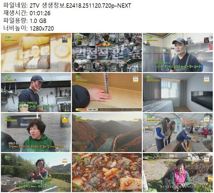 | 2TV 생생정보.E2418.251120.720p-NEXT.mp4 | 1 G | 01:01:00 | 1280x720 |