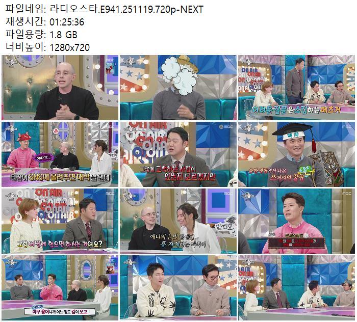 | 라디오스타.E941.251119.720p-NEXT.mp4 | 1.8 G | 01:25:00 | 1280x720 |
