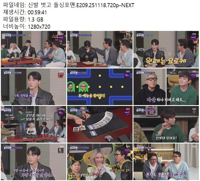| 신발 벗고 돌싱포맨.E209.251118.720p-NEXT.mp4 | 1.3 G | 00:59:41 | 1280x720 |